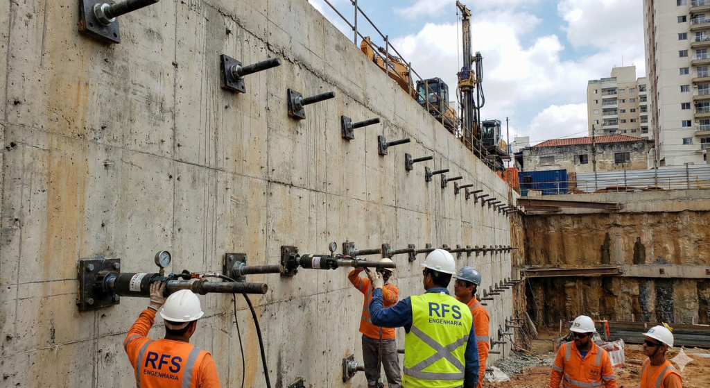 Os tirantes são permanentes ou provisórios? A RFS Engenharia executa ambos. Tirantes provisórios são usados para conter uma escavação até que a estrutura definitiva do prédio (lajes e pilares) assuma as cargas. Tirantes permanentes recebem proteção anticorrosiva especial (bainhas duplas) e são projetados para durar toda a vida útil da obra (ex: contenção de uma rodovia).